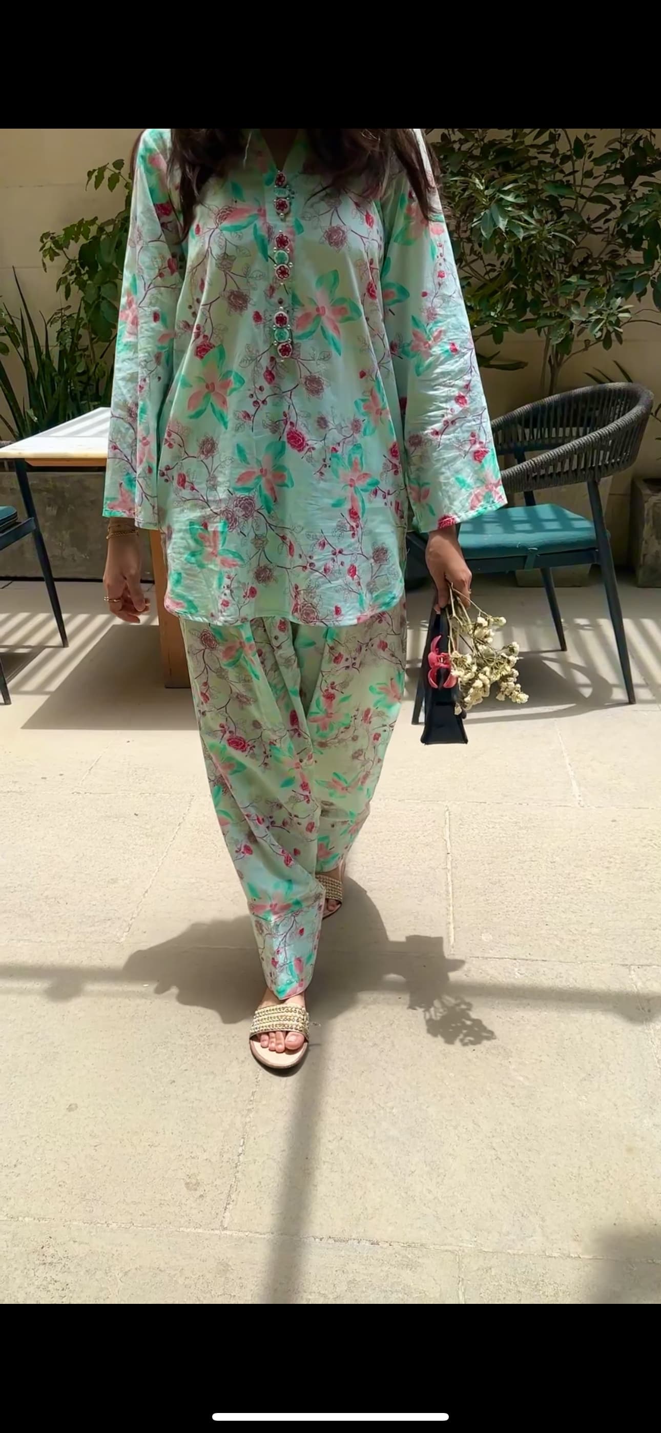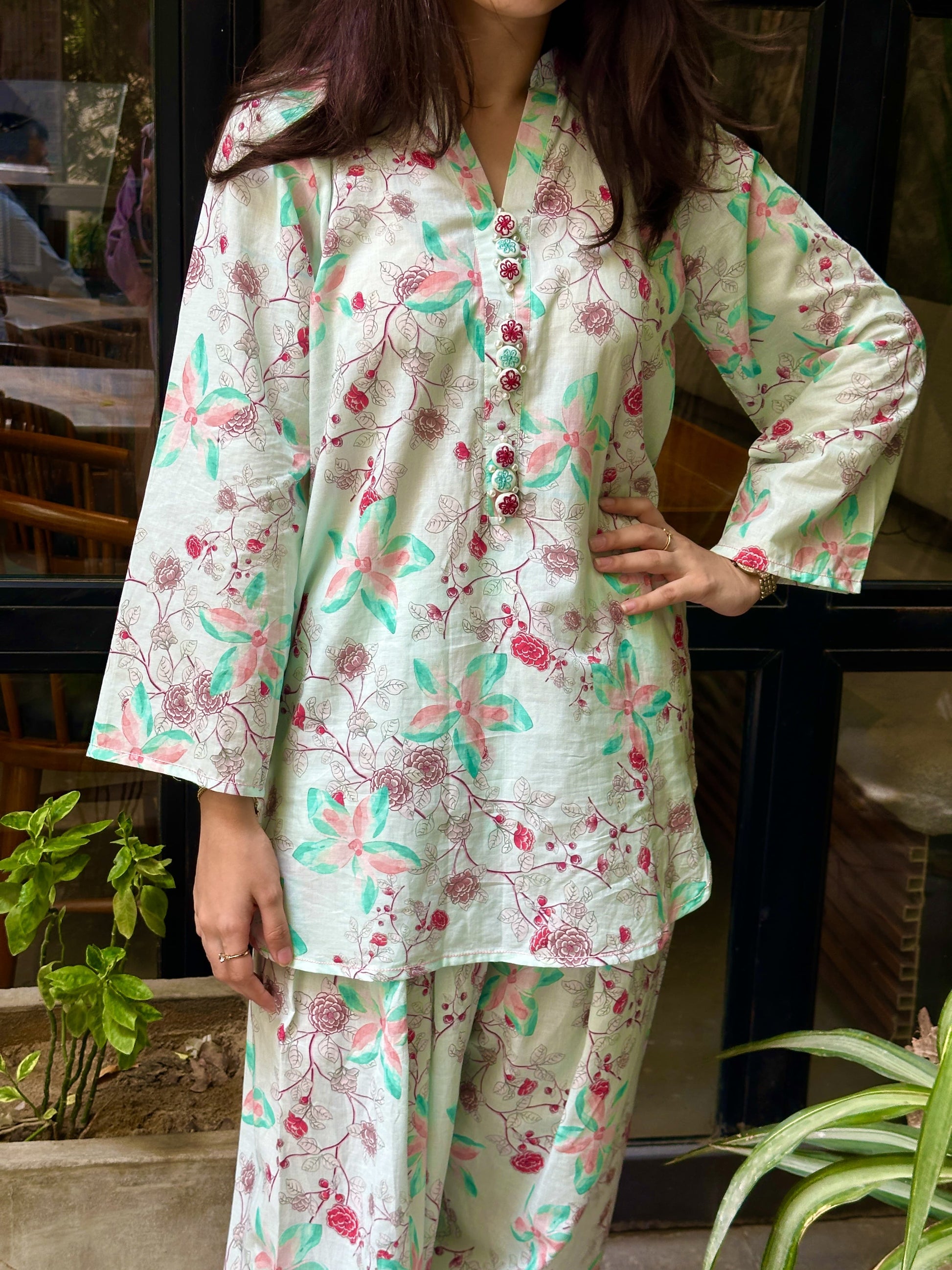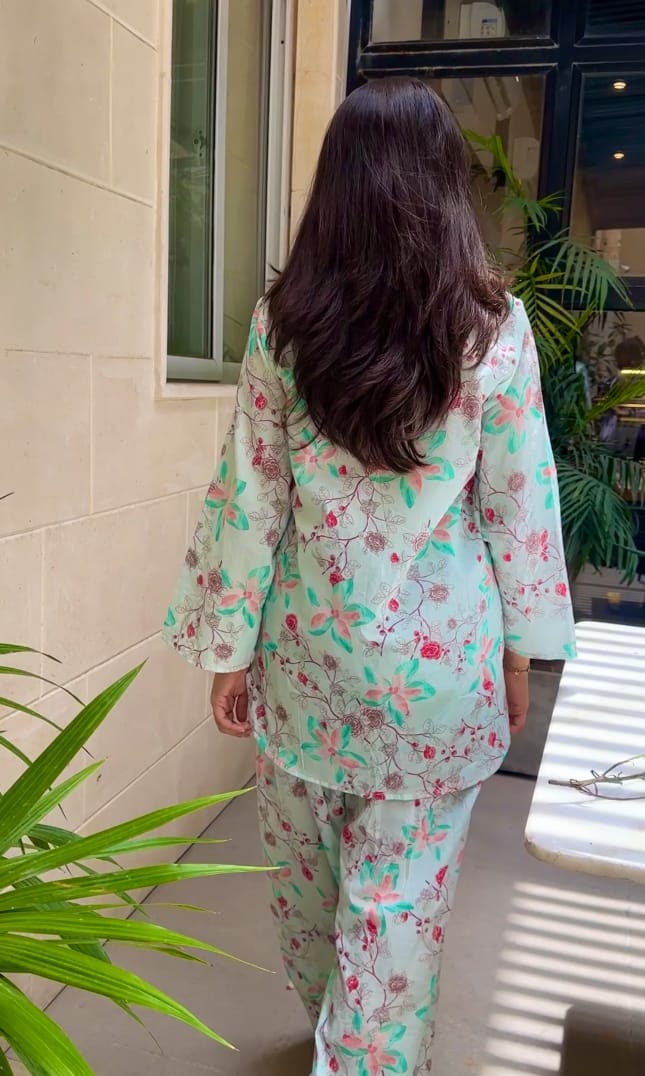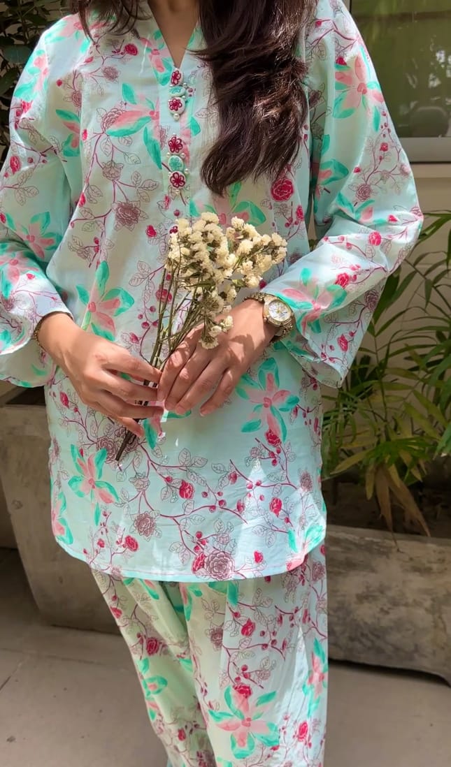 Introducing our newest arrival: 💮This stunning short shirt with farshi shalwar features a vibrant floral print in soothing light green hues, perfect for a fresh and elegant look. Pair it with your favorite accessories and rock the day💃