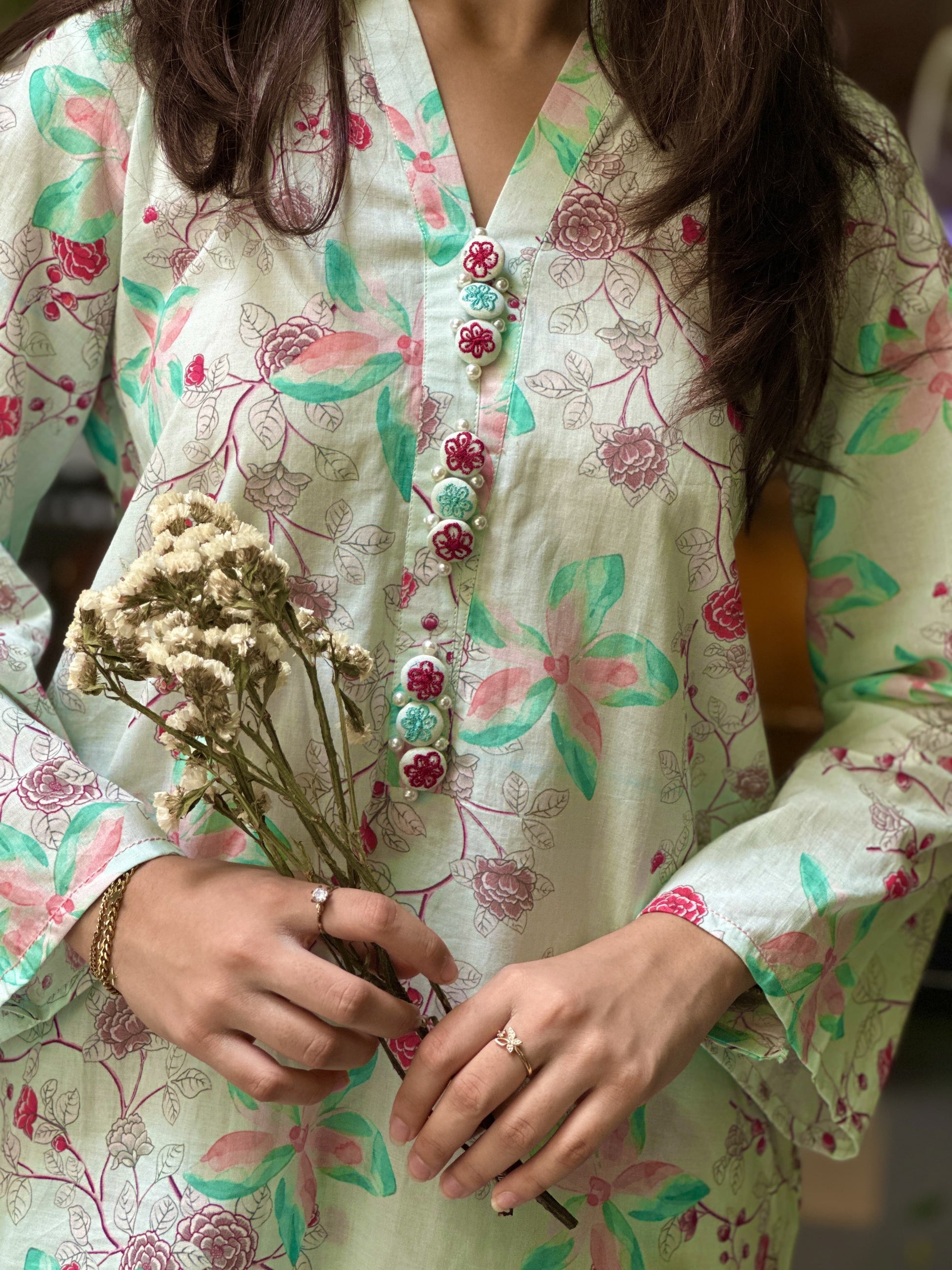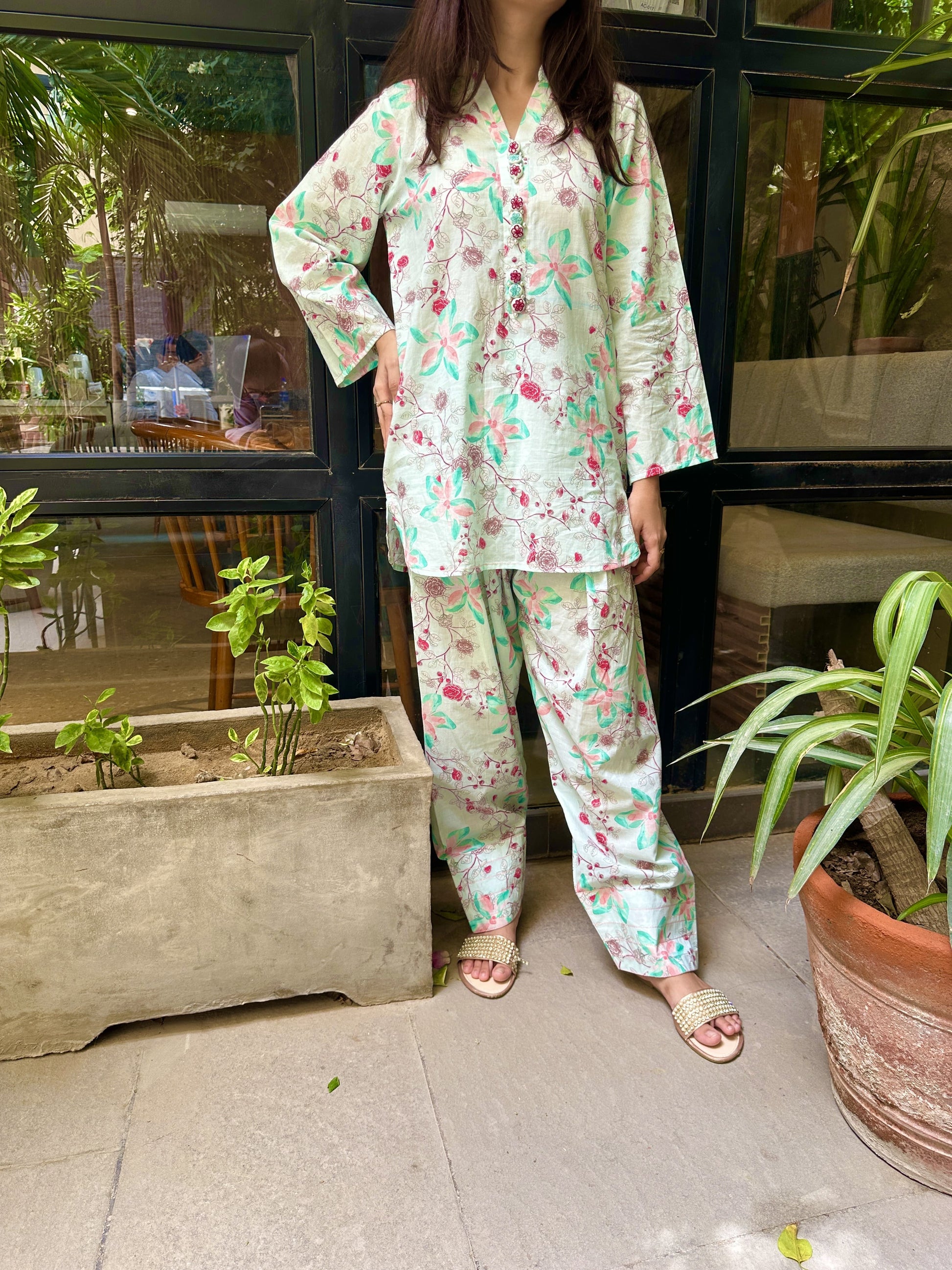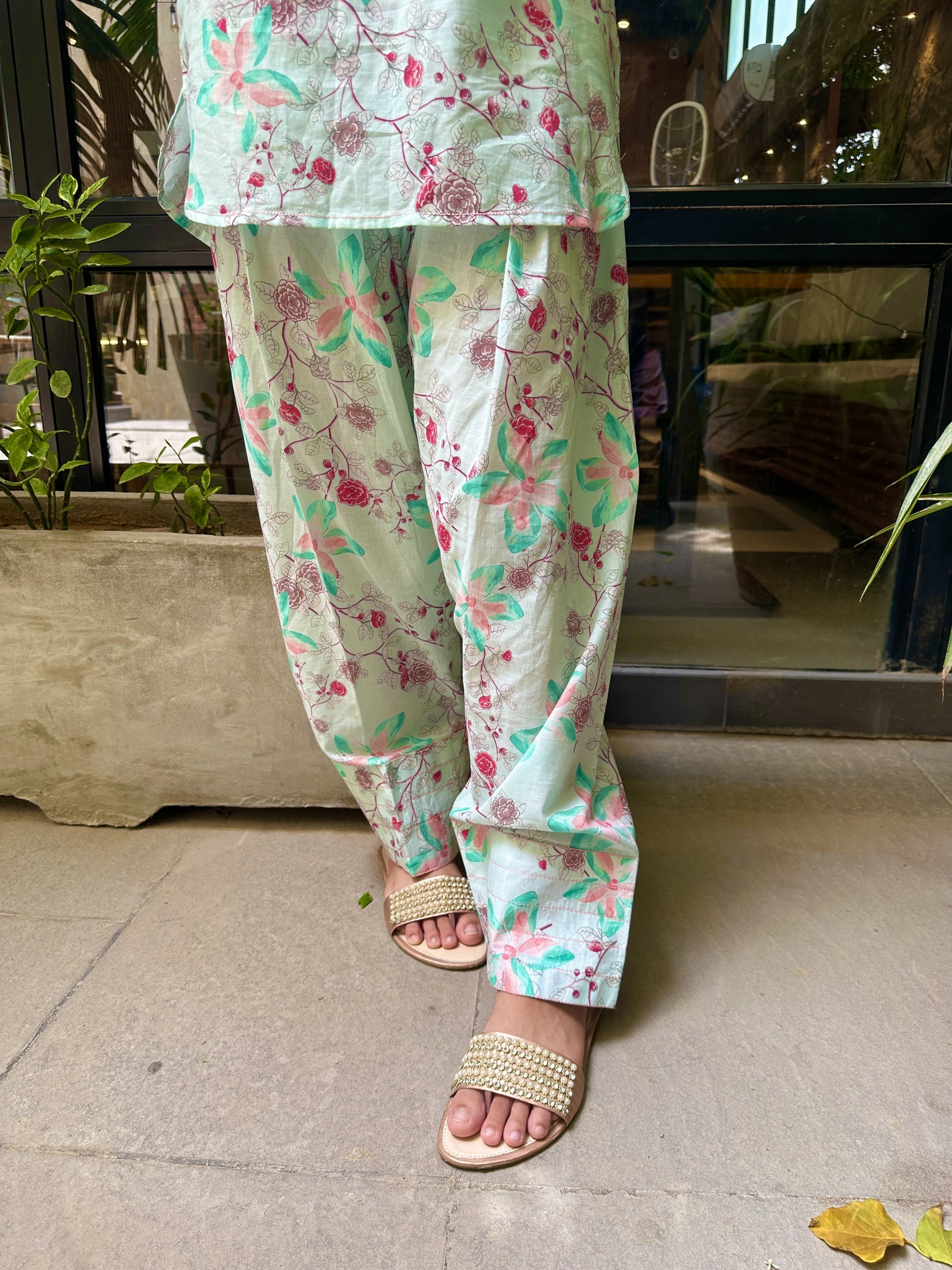 Introducing our newest arrival: 💮This stunning short shirt with farshi shalwar features a vibrant floral print in soothing light green hues, perfect for a fresh and elegant look. Pair it with your favorite accessories and rock the day💃