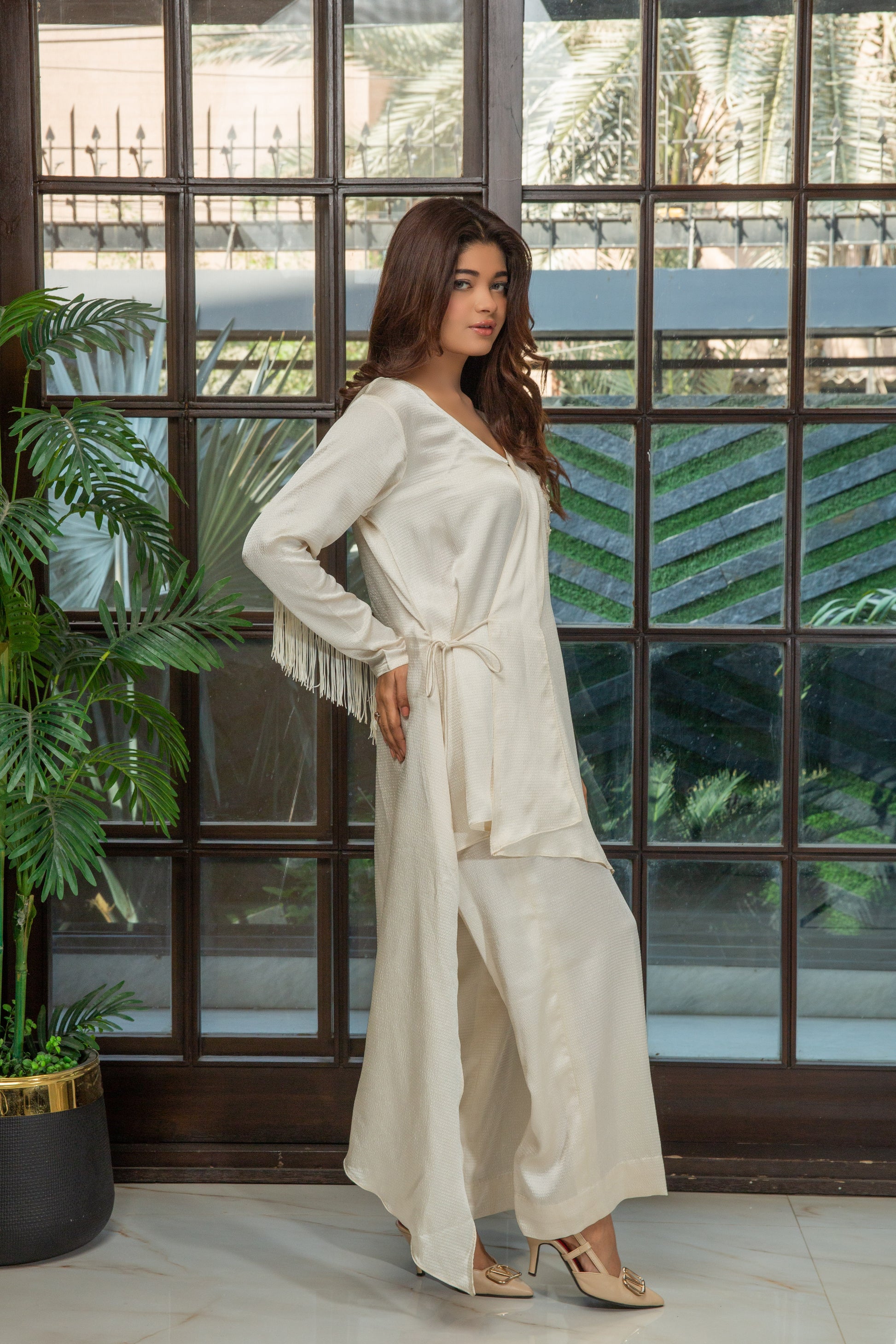 Classic Charm meet modern flair. In this asymmetrical pearl white frock. Refine embroidered patches and dori detailing create a flattering silhouette. Soft fabric insure comfort and style